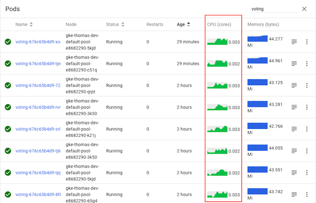 As we can see, the CPU graphs for all pods are active, indicating that all pods are now taking traffic—without having to change a line of code. Voila, gRPC load balancing as if by magic!