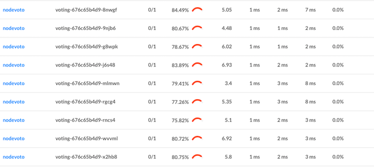 Linkerd also gives us built-in traffic-level dashboards, so we don't even need to guess what's happening from CPU charts any more. Here's a Linkerd graph that's showing the success rate, request volume, and latency percentiles of each pod: